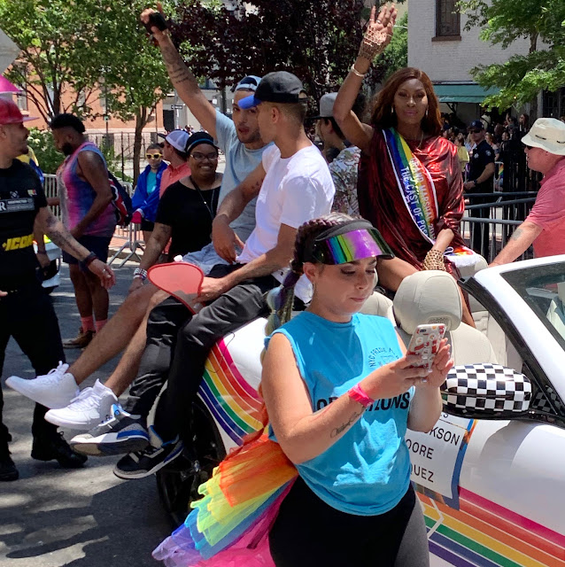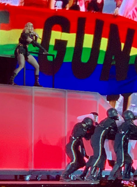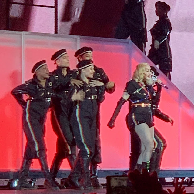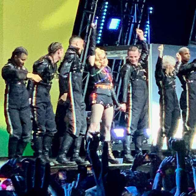 I spent the day in front of The Stonewall where I watched the NYC Gay Pride Parade sail by me. I shook hands with, hugged and kissed more people (both in the parade and the crowd) than I ever knew I would. I told as many people as I could that they were beautiful and I wished them love and happiness. They ALL responded in kind. Afterwards I walked 50 blocks draped in a Pride flag receiving winks, hugs and high fives from other celebrants. I am so grateful to live in a time and a place where all of this is possible. I am proud to be a member of a community that includes ALL races, religions and genders. The older I get the greater my capacity to love (and receive love) grows. The older I get the more I realize how blessed I am in every way. Later I stood on a platform, watching a glorious sunset, dancing and fully engaged in the joy around me as I waited for Madonna to perform. This city gave me a birthplace, my family, many friends, my art education and my career. It also gave me my OTHER family. What a time to be alive!